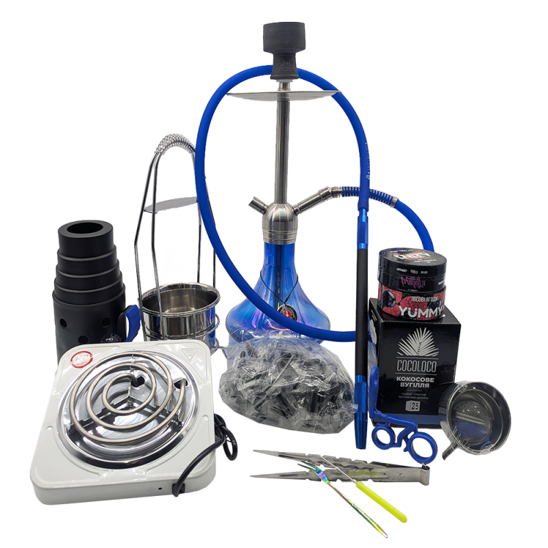 У набір входять: Кальян Amy SS 13R Blue (синій, повний комплект) Колба Шланг (утримувач, конектор) Мундштук Чаша глина Ущільнювачі Калауд Щипці Дифузор Пружина для силіконового шланга для кальяну. Електроплита, електропіч для вугілля 1000W White (1 конфорка) Вилка металева для тютюну Chameleon (Хамелеон) Одноразові мундштуки для кальяну LUX (Чорні, конус) Ковпак для кальяну Лесенка (Великий, Чорний) Кошик для вугілля Silver (Металік) Пружина для силіконового шланга для кальяну. Кокосове вугілля для кальяну Cocoloco (1 кг, 72 шт, р25) Тютюн Unity Fruittella (Фрутелла, 100 г) Тютюн Yummy Лісові Ягоди (100 г)