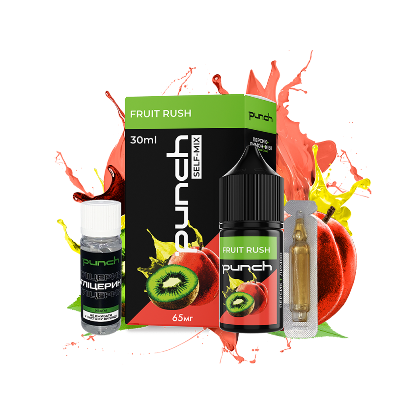 Набор для самозамеса Punch Fruit rush (Киви Лимон Персик, 65 мг, 30 мл) предоставляет вейперам уникальные вкусовые ощущения. Эта жижка идеально подходит для многоразовых вейпов благодаря своей оптимальной густоте, безопасному составу и приятному аромату, открывая новые грани вкуса.