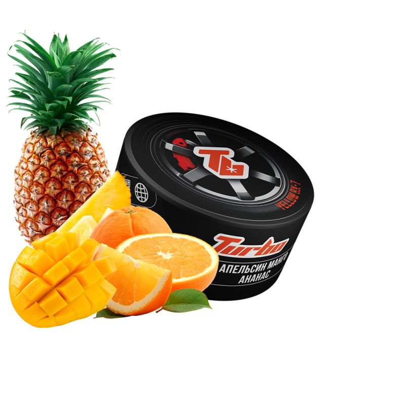 Найпопулярнішим серед поціновувачів димного відпочинку є Тютюн Turbo Yellow RX7 (Апельсин Манго Ананас, 100 г) від Turbo. Основа кальянної заправки — це тютюновий лист Virginia, Burley високої якості, а також натуральні ароматизатори, патока та чистий гліцерин. Завдяки цьому тютюн має насичений смак Ананас, Апельсин, Манго, приємний аромат і здатний утворювати густий дим.